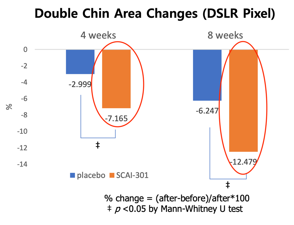 - N MODE F cream significantly reduced the surface area and volume of the double chin after 4 and 8 weeks compared to the placebo group (p<0.05)